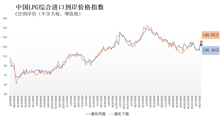 1月30日-2月5日中国液化丙烷、丁烷综合进口到岸价格指数分别为136.39、140.03