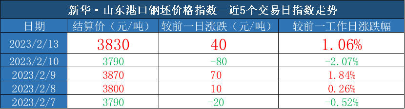 新华财经北京2月13日电(吕世阔)截至2023年2月13日,新华·山东港口钢坯价格指数报3830元/吨,较前一交易日上涨40元/吨,涨幅1.06%。