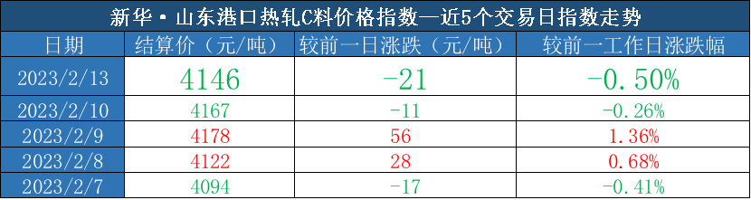 新华指数|2月13日山东港口大商中心钢坯、热轧C料价格涨跌不一