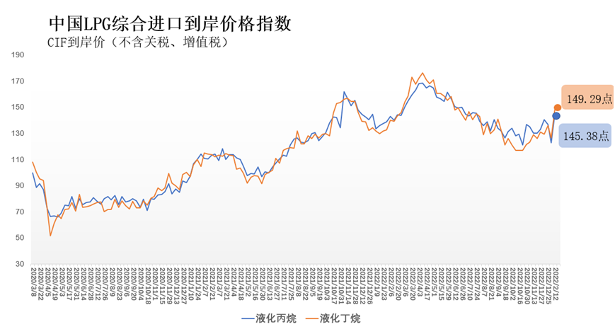 2月6日-12日中国液化丙烷、丁烷综合进口到岸价格指数为145.38、149.29