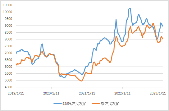 图表:中国汽柴油批发价格指数周度均价走势图(单位:元/吨)