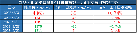 截至2023年3月3日,新华·山东港口热轧C料价格指数报4363元/吨,较前一交易日上涨32元/吨,涨幅0.74%。