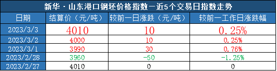 新华财经北京3月3日电(吕世阔)截至2023年3月3日,新华·山东港口钢坯价格指数报4010元/吨,较前一交易日上涨10元/吨,涨幅0.25%。