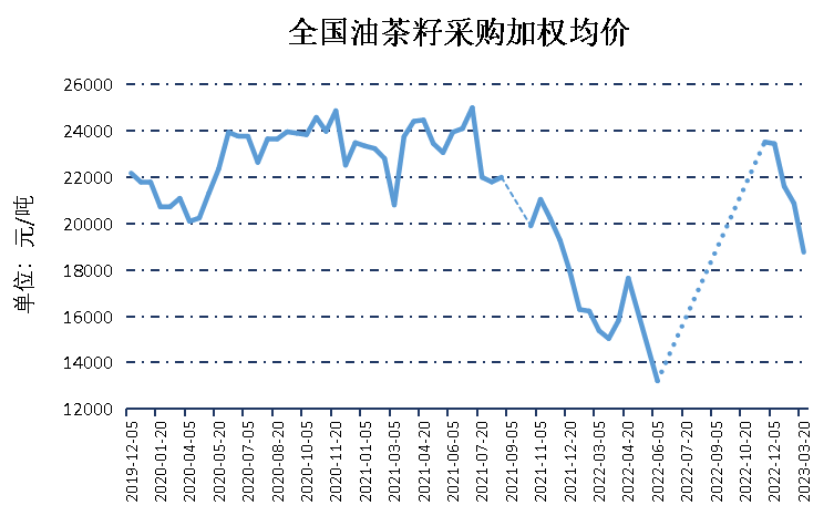 从全国市场看,各地区重点油茶企业含油率25%以上的油茶籽采购均价在19186.67元/吨至19700元/吨不等,全国重点省区油茶企业含油率25%以上的油茶籽采购均价报18767.49元/吨,较上期(3月5日)下跌10.10%,同比上涨24.76%。