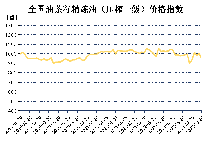截至3月20日,全国油茶籽精炼油(压榨一级)价格指数报953.41点,较2023年3月5日发布的1005.53点下跌52.12点,跌幅5.18%,指数大幅下跌;指数较基期下跌46.59点,跌幅4.66%。