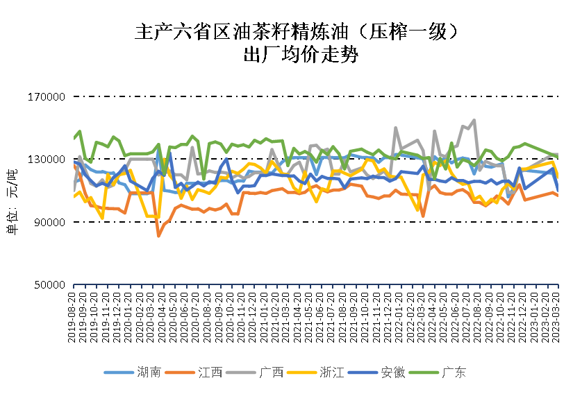 调研显示,3月上半月,全国各地区油茶原料的收购及油茶产品集中加工生产已基本结束,油茶销售结束了传统的旺季,且旅游消费及礼品消费未出现明显提振效果,相较春节期间油茶企业销售信心减弱,产品价格回落。且随着节日过后,电商销售规模和企业促销活动减少,油茶产品行情呈弱稳状态,未来短期,油茶籽精炼油(压榨一级)价格或将保持当前水平。