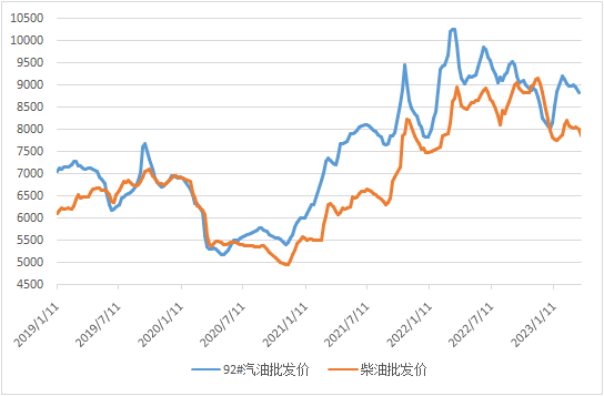 图表:中国汽柴油批发价格指数周度均价走势图(单位:元/吨)