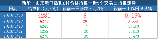 截至3月30日,新华·山东港口热轧C料价格指数报4281元/吨,较前一交易日上涨8元/吨,涨幅0.19%。