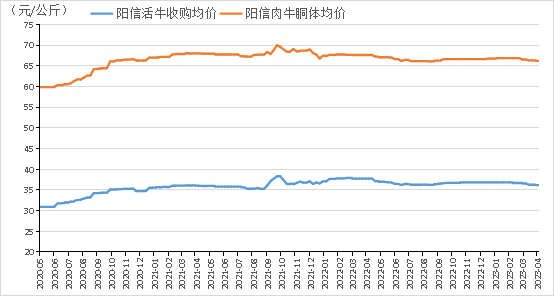 具体价格方面,截至4月3日,阳信活牛收购均价报36.18元/公斤,环比下跌0.41元/公斤;肉牛胴体均价报66.24元/公斤,环比下跌0.34元/公斤。