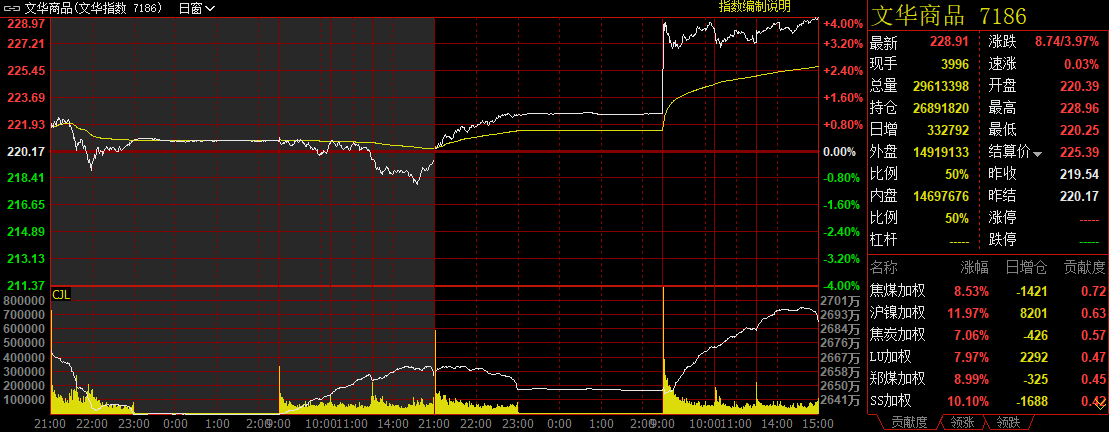 新华财经北京3月7日电(张瑶、郭洲洋)截至3月7日下午收盘,追踪国内商品市场的综合指数收报228.91点,较上一交易日上涨8.74点,涨幅3.97%。上涨品种中,沪镍、SC原油、燃油、低硫燃料油(LU)、沥青、PTA主力合约涨停;不锈钢(SS)主力合约涨超10%;动力煤主力合约涨超9%;焦煤主力合约涨超8%;硅铁、焦炭、铁矿主力合约涨超7%;郑醇、液化石油气(LPG)、菜粕主力合约涨超6%,乙二醇(EG)、苯乙烯(EB)主力合约涨超5%。下跌品种中,红枣、生猪主力合约跌近4%。