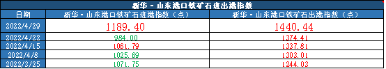 截至2022年4月29日,新华·山东港口铁矿石进港指数报1189.40点,较4月22日上涨205.40点,涨幅20.87%;新华·山东港口铁矿石出港指数报1440.44点,较4月22日上涨66.03点,涨幅4.80%。