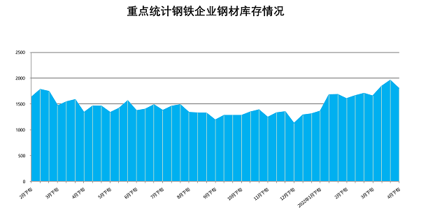 2022年4月下旬,重点统计钢铁企业钢材库存量1808.87万吨,比上一旬减少157.85万吨、降低8.03%;比上月底(即上月同旬)增加146.87万吨、增长8.84%;比年初增加679.18万吨、增长60.12%;比去年同期增加467.49万吨、增长34.85%。