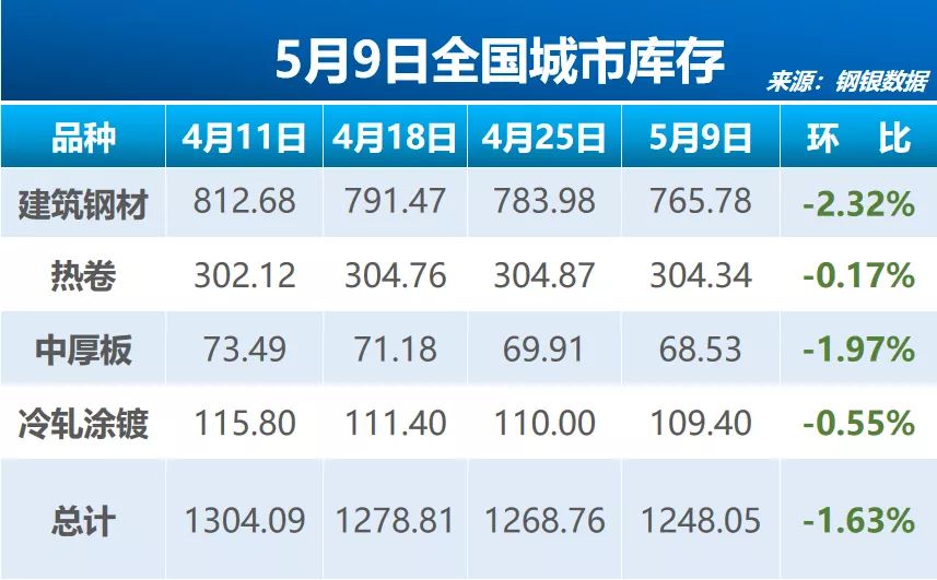 钢银电商9日公布数据显示,截至5月9日当周,全国39个城市,共计142个仓库的城市钢铁总库存量为1248.05万吨,较节前环比减少20.71万吨,降幅1.63%。