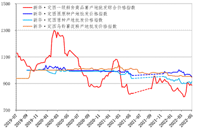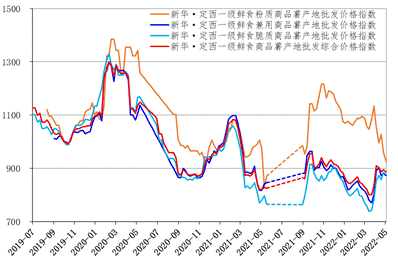 尾货品质参差不齐导致定西商品薯价格微幅下跌;马铃薯补种带动定西原种价格略涨;进口量价差异的环境下,定西马铃薯全粉价格上涨、定西马铃薯淀粉价格继续下调。截至2022年5月6日,新华•定西一级鲜食商品薯产地批发综合价格指数报887.06点,环比下跌0.89%,同比上涨7.98%;新华•定西原原种产地批发价格指数报952.62点,环比下跌0.84%,同比下跌2.34%;新华•定西原种产地批发价格指数报915.02点,环比上涨1.72%,同比下跌5.18%;新华•定西马铃薯淀粉产地批发价格指数报946.57点,环比下跌0.81%,同比下跌6.60%。