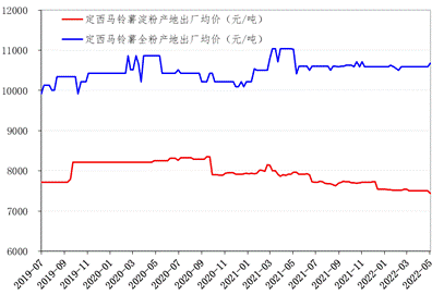 进口马铃薯淀粉,尤其从马来西亚转口的完税价格远低于国内马铃薯淀粉的出厂价格,对国内马铃薯淀粉市场造成较大冲击,导致定西马铃薯淀粉出厂价格连续走低。对应地,马铃薯全粉的进口完税价格高于国内出厂价格,带动了定西马铃薯全粉价格略涨。截至2022年5月6日,定西马铃薯淀粉产地出厂均价报7443.48元/吨,环比下跌0.81%,同比下跌6.60%;定西马铃薯全粉产地出厂均价报10674.00元/吨,环比上涨0.82%,同比下跌3.16%。鉴于国内市场拥挤态势,定西初级薯制品需要依托甘肃向西发展战略,努力拓展国外渠道,保障定西马铃薯产业平稳发展。