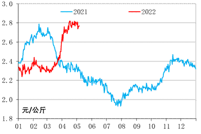 进入五月份,北方一作区有部分补种需求,带动了定西原种价格上涨。对应地,商品薯价格连年走低,促发种薯繁育情绪低迷,定西原原种销售价格持续走低。截至2022年5月6日,定西原原种产地批发均价报3874.10 元/万粒,环比下跌0.84%,同比下跌2.34%;定西原种产地批发均价报2526.80 元/吨,环比上涨1.72%,同比下跌5.18%。与薯制品行情类似,可以尝试开辟中亚的种薯市场,尤其人口快速增长的乌兹别克斯坦。