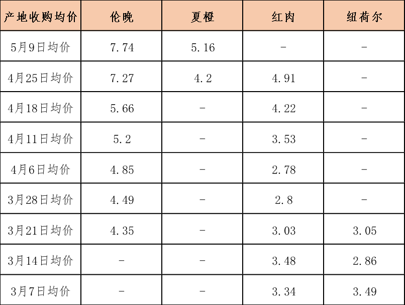 截至5月9日,秭归伦晚脐橙产地收购均价报7.74元/公斤,环比上涨0.47元/公斤,涨幅6.48%;同比上涨3.46元/公斤,涨幅81.11%。秭归夏橙产地收购均价报5.16元/公斤,环比上涨0.96元/公斤,涨幅22.91%。