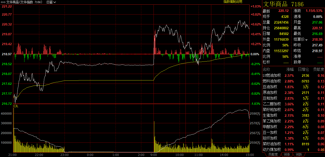 截至13日收盘时,追踪国内商品市场的综合指数收报220.12点,较前一交易日上涨1.15点,涨幅0.53%。全天商品市场累计净流入资金68.14亿元。