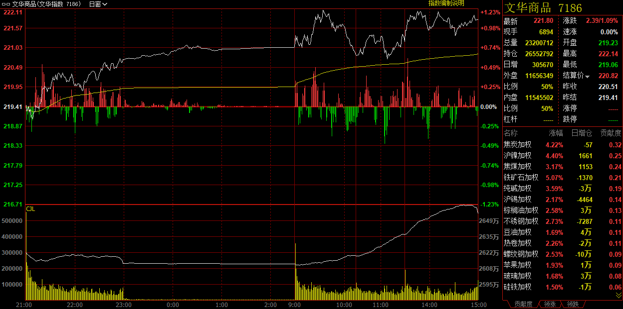 截至20日下午收盘,追踪国内商品市场的综合指数收报221.80点,较上一交易日上涨2.39点,涨幅1.09%。全天商品市场累计净流入资金44.21亿元。