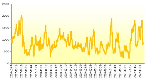 2022年5月20日,新华-中国(海南)皇帝蕉产地价格指数报870.80点,较5月13日上涨89.72点,涨幅11.49%;较基期下跌129.20点,跌幅12.92%。