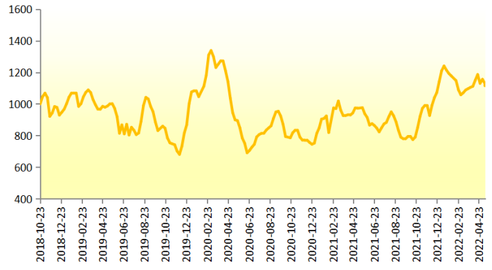 2022年5月18日,新华-进口香蕉价格指数报1114.98点,较5月11日下跌14.20点,跌幅1.26%;较基期上涨114.98点,涨幅11.50%。