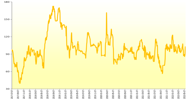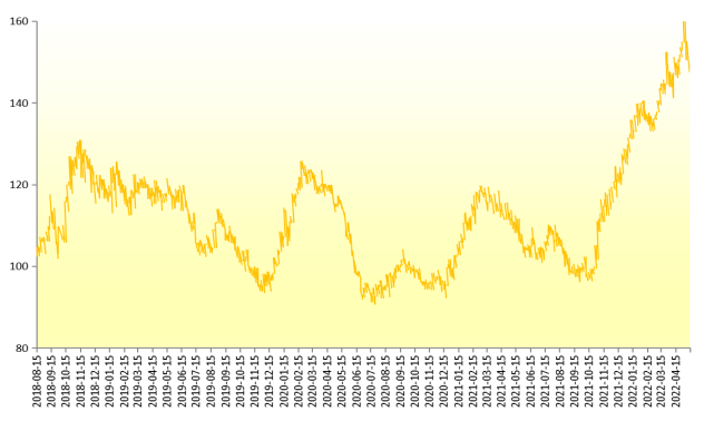 2022年5月22日,新华-香蕉销地批发价格指数报149.24点,较5月15日下跌1.36点,跌幅0.91%;较基期上涨49.24点,涨幅49.24%。