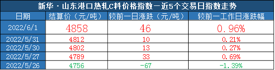 截至2022年6月1日,新华·山东港口热轧C料价格指数报4858元/吨,较前一交易日上涨46元/吨,涨幅0.96%。