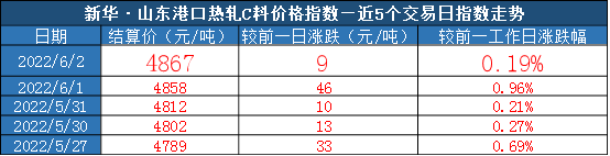 截至2022年6月2日,新华·山东港口热轧C料价格指数报4867元/吨,较前一交易日上涨9元/吨,涨幅0.19%。