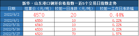 新华财经北京6月2日电(吕世阔) 截至2022年6月2日,新华·山东港口钢坯价格指数报4570元/吨,较前一交易日上涨20元/吨,涨幅0.44%。