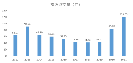 2021年上海黄金交易所铂金交易量创下了自铂金业务上线以来的历史新高,为120.60吨(双边交易量),与2020年相比,增幅达43%,与2017-2019年这三年的均值水平相比,增幅更是接近187%。
