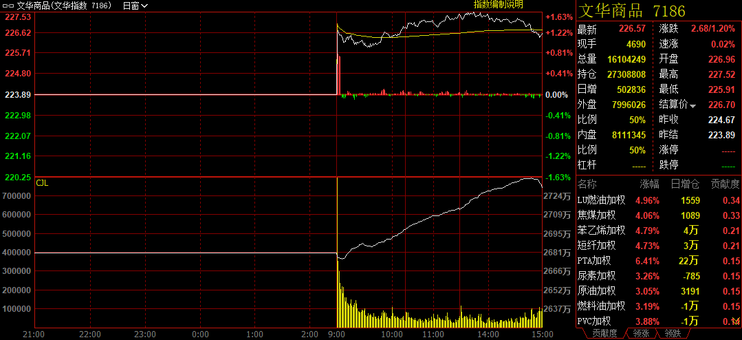 截至6日下午收盘时,追踪国内商品市场的综合指数收报226.57点,较上一个交易日上涨2.68点,涨幅1.2%。全天商品市场累计净流入资金88.73亿元,其中PTA主力合约净流入资金13.47亿元。