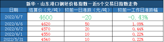 新华财经北京6月7日电(吕世阔) 截至2022年6月7日,新华·山东港口钢坯价格指数报4600元/吨,较前一交易日下跌20元/吨,跌幅0.43%。