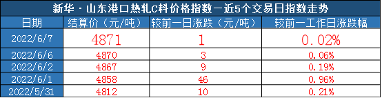 截至2022年6月7日,新华·山东港口热轧C料价格指数报4871元/吨,较前一交易日上涨1元/吨,涨幅0.02%。