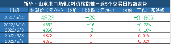 新华财经·指数|山东港口大商中心钢坯、热轧C料价格指数日报(6月13日)