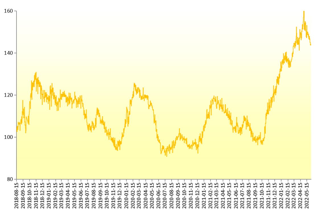 2022年6月12日,新华-香蕉销地批发价格指数报144.23点,较6月5日下跌3.66点,跌幅2.47%;较基期上涨44.23点,涨幅44.23%。
