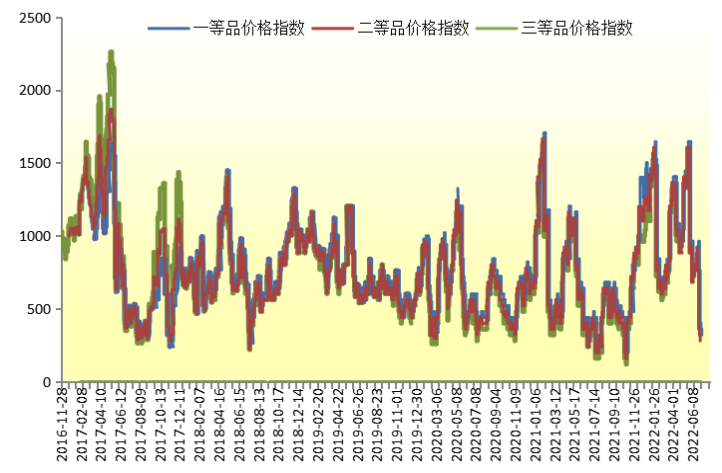 2022年6月10日,海南省皇帝蕉一等品价格指数报321.25点,较6月1日下跌441.72点,跌幅57.89%;较基期下跌678.75点,跌幅67.87%。二等品价格指数报281.09点,较6月1日下跌441.72点,跌幅61.11%;较基期下跌718.91点,跌幅71.89%;三等品价格指数报240.94点,较6月1日下跌441.72点,跌幅64.71%;较基期下跌759.06点,跌幅75.91%。