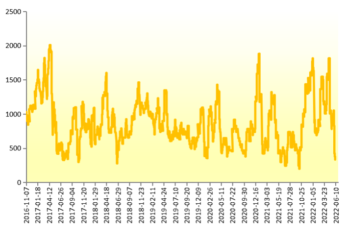 其中广西、海南、云南、福建、广东产区指数分别报138.33点、178.56点、60.47点、142.86点、103.13点。本期(2022.6.6-6.10),海南产区统货均价约为2.31元/斤,较前一期(2022.5.30-6.1)上涨0.23元/斤,涨幅11.06%;云南产区统货均价约为1.33元/斤,较前一期(2022.5.30-6.1)下跌0.17元/斤,跌幅11.33%;广东产区统货均价约为1.23元/斤,较前一期(2022.5.30-6.1)下跌0.37元/斤,跌幅22.92%。