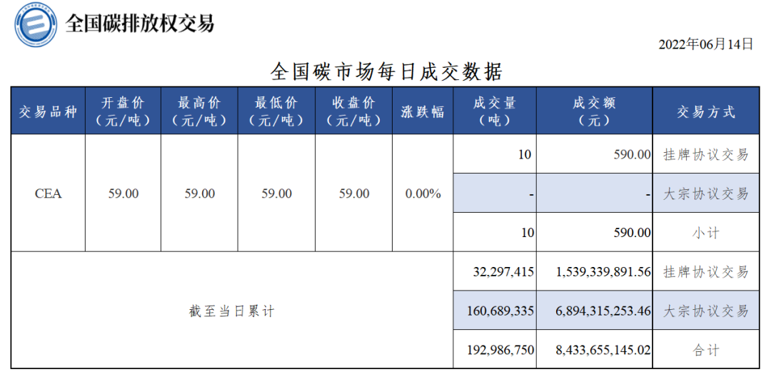 6月14日全国碳市场碳排放配额(CEA)挂牌协议交易成交量10吨,成交额590.00元,开盘价59.00元/吨,最高价59.00元/吨,最低价59.00元/吨,收盘价59.00元/吨,收盘价与前一日持平。
