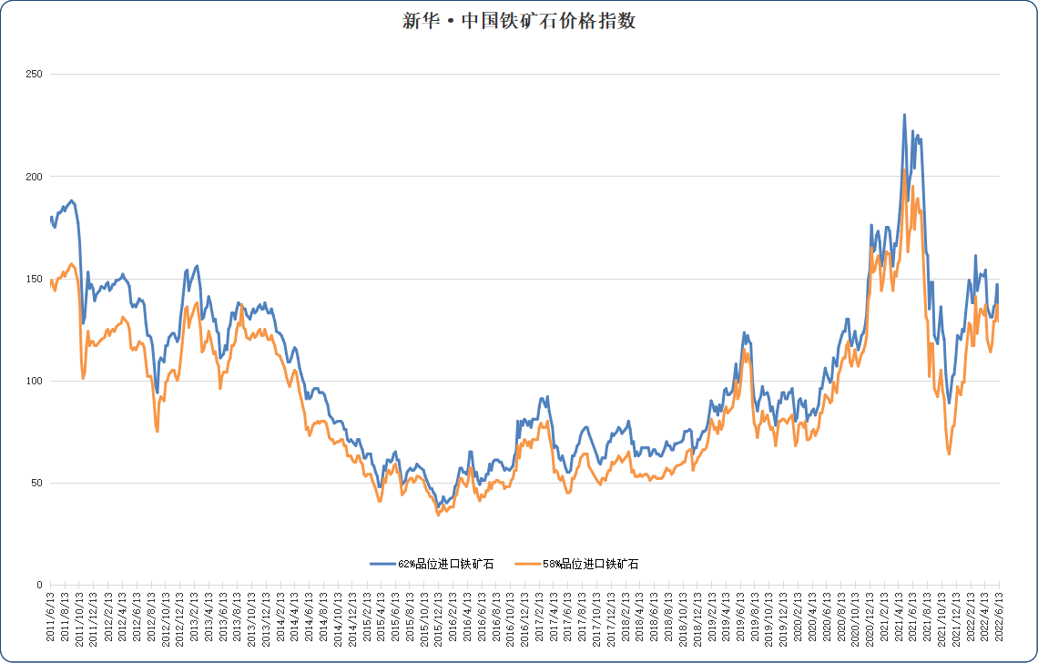 新华·中国铁矿石价格指数显示,6月7日至6月13日间,进口铁矿石价格偏弱运行。