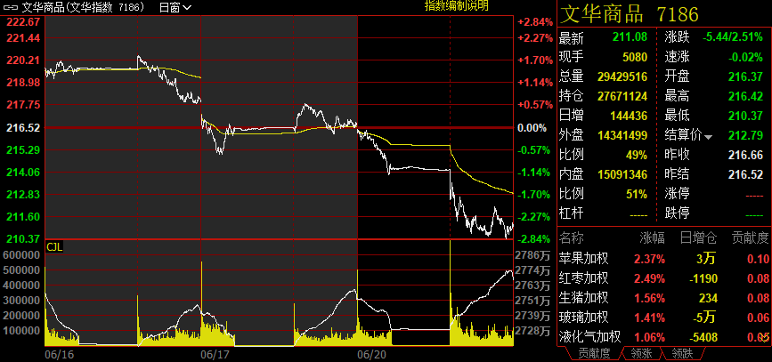 新华财经北京6月20日电(郭洲洋、吴郑思)国内商品市场6月20日跌多涨少,截至下午收盘,追踪国内商品市场的综合指数收报211.08点,较上一交易日下跌5.44点,跌幅2.51%。下跌品种中,焦炭主力合约跌超11%;铁矿主力合约收跌停,跌幅10.98%;焦煤主力合约跌超10%;热卷主力合约跌超6%;螺纹钢、原油、乙二醇主力合约跌超5%。上涨品种方面,苹果、红枣主力合约涨超2%。