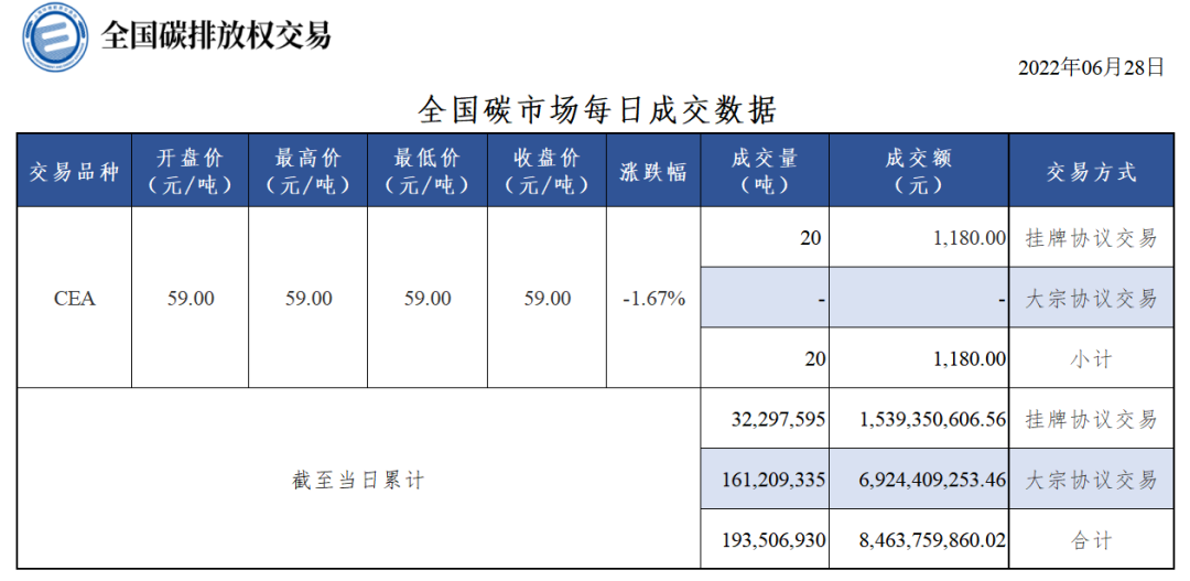 6月28日全国碳市场收盘价59.00元/吨 较前一日下跌1.67%