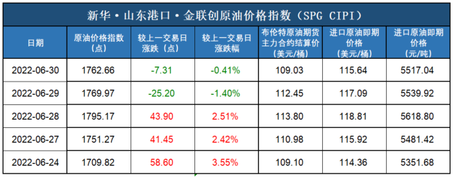新华财经北京7月1日电(杨猛) 截至2022年6月30日,新华·山东港口·金联创原油价格指数(SPG CIPI)报1762.66点,较前一交易日下跌7.31点,跌幅0.41%;进口原油即期价格为115.64美元/桶,合人民币5517.04元/吨。山东港口进口原油综合到岸贴水估价为4.48美元/桶,较前一交易日上涨0.21美元/桶,涨幅4.92%。