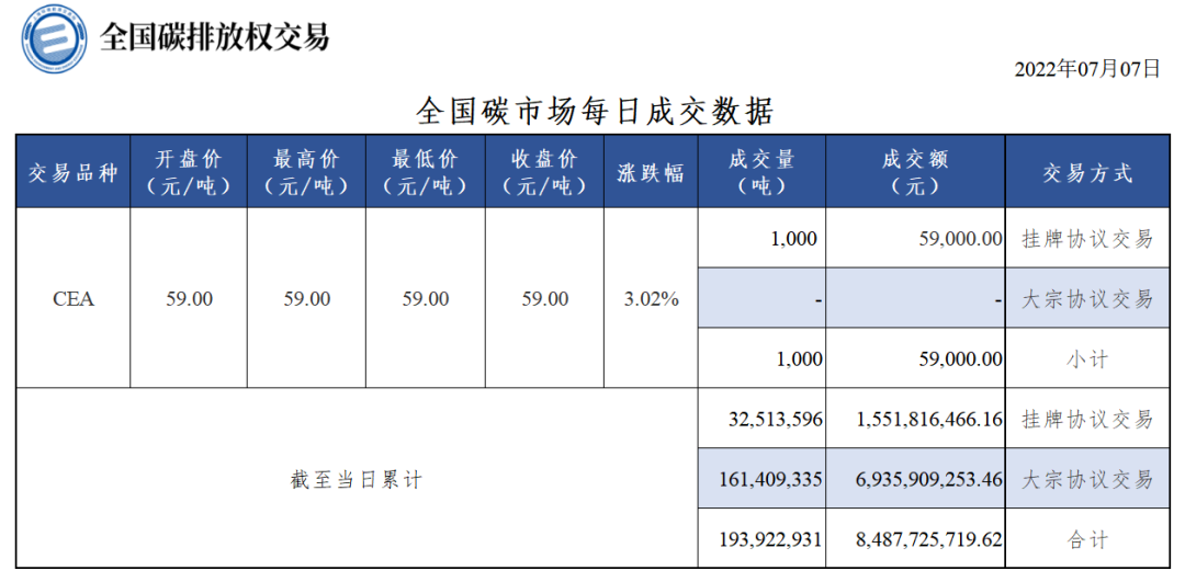 7月7日全国碳市场收盘价59.00元/吨 较前一日上涨3.02%