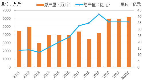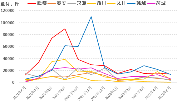 数据显示,从月均批发量对比来看,武都花椒具有明显优势。近年来,市场需求的稳定成功带动武都椒农的种植热情,2020和2021年,武都花椒产量始终维持在6000万斤。尽管受到疫情影响,2021-2022产年花椒行业总体销售不畅,但得益于稳定的市场需求,武都花椒月度抽样批发量仍稳居七大产区前列。
