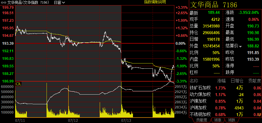 新华财经北京7月13日电(郭洲洋、左元)7月13日国内商品市场大面积下跌,截至下午收盘,追踪国内商品市场的综合指数收报189.44点,较上一交易日下跌3.95点,跌幅2.04%。下跌品种中,燃料油主力合约跌超8%;PTA主力合约跌停,跌幅达7.01%;棉花主力合约收跌6.99%;尿素、短纤、沥青、棕榈油主力合约跌超5%;棉纱、豆油、20号胶(NR)主力合约跌超4%。上涨品种方面,铁矿石、纸浆主力合约涨超1%。