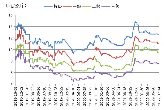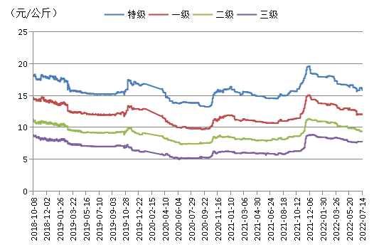 批发市场方面,截至7月14日,与上周同期相比,河北、河南各等级骏枣、灰枣价格持平。调研显示,近期红枣消费需求不足,市场走货量较小,婚庆、餐饮等红枣消费需求仍未明显恢复,批发市场枣企销售信心受到干扰,但因2021年采收的红枣原料成本高,很多小型枣企退出市场,降价清仓及低价竞争现象有所好转,目前企业多在观望红枣新产季情况,价格稳定。