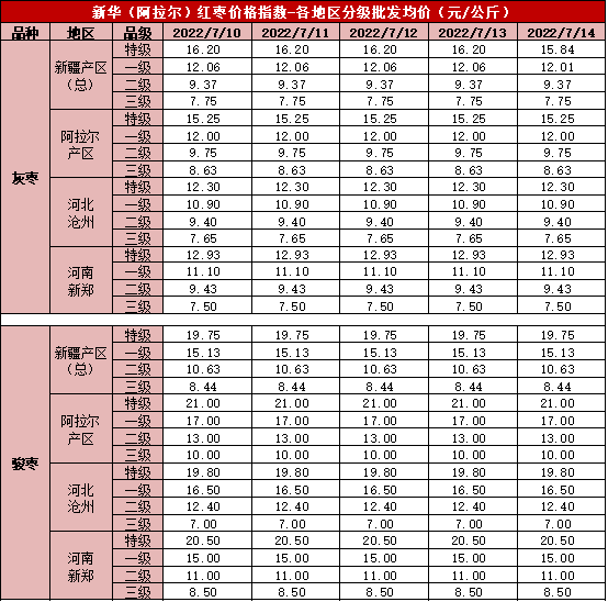 新华财经北京7月15日电(吕世阔、周宇涵) 7月14日发布的新一期新华(阿拉尔)红枣价格指数显示,7月8日至7月14日当周,新疆产区红枣价格周环比微幅下跌,批发市场红枣价格周环比持平。