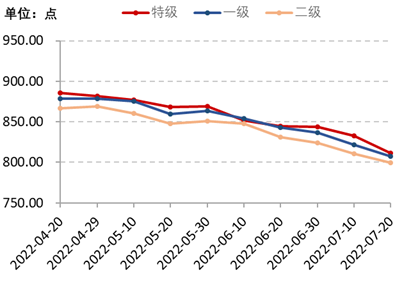从质量等级维度来看,七月中旬全国各等级花椒指数均出现回调,各等级花椒价格差距缩小。截至7月20日,特级花椒价格指数报811.31点,较上期下跌2.56%,较基期下跌18.87%;一级花椒价格指数报807.73点,较上期下跌1.71%,较基期下跌19.23%;二级花椒价格指数报799.46点,较上期下跌1.37%,较基期下跌20.05%。