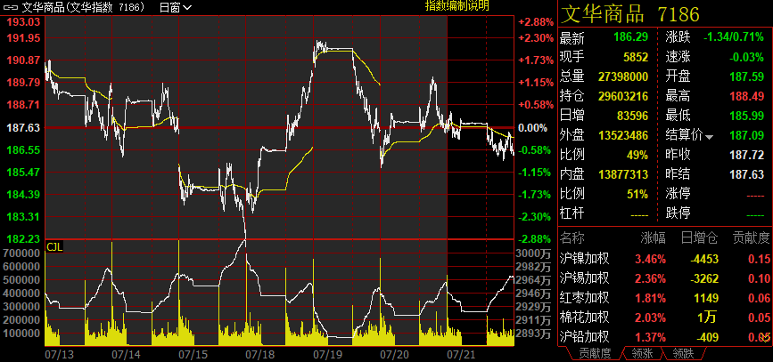 新华财经北京7月21日电(郭洲洋、张瑶)7月21日国内商品市场跌多涨少,截至下午收盘,追踪国内商品市场的综合指数收报186.29点,较上一交易日下跌1.34点,跌幅0.71%。上涨品种中,沪镍主力合约涨超4%;棉花主力合约涨超3%;沪锡主力合约涨超2%。下跌品种方面,焦煤主力合约跌超4%;玻璃、聚丙烯(PP)、生猪主力合约跌超3%;塑料、棕榈油、尿素、燃料油、焦炭、苯乙烯、LU主力合约跌超2%。