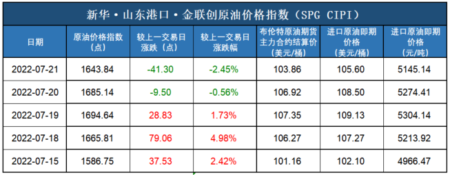 新华财经北京7月22日电(杨猛) 截至2022年7月21日,新华·山东港口·金联创原油价格指数(SPG CIPI)报1643.84点,较前一交易日下跌41.30点,跌幅2.45%;进口原油即期价格为105.60美元/桶,合人民币5145.14元/吨。山东港口进口原油综合到岸贴水估价为6.26美元/桶,较前一交易日上涨0.51美元/桶,涨幅8.87%。